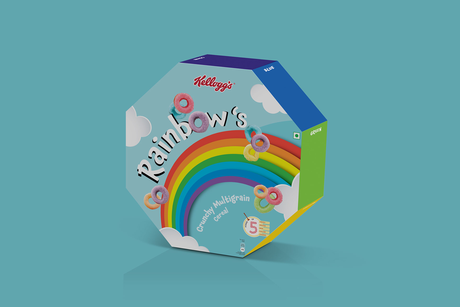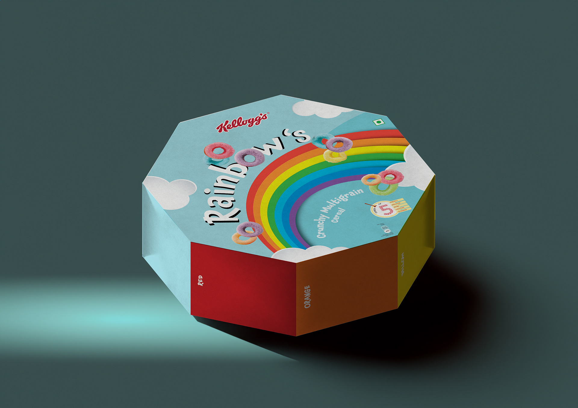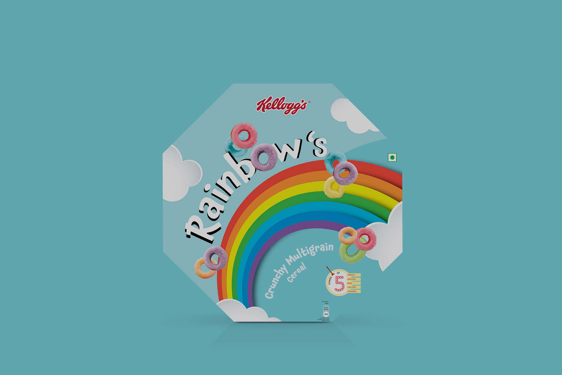 This is a packaging design for a fictional cereal named "Rainbow's" under Kellogg's, which is inspired from its existing product "Fruit Loops".
