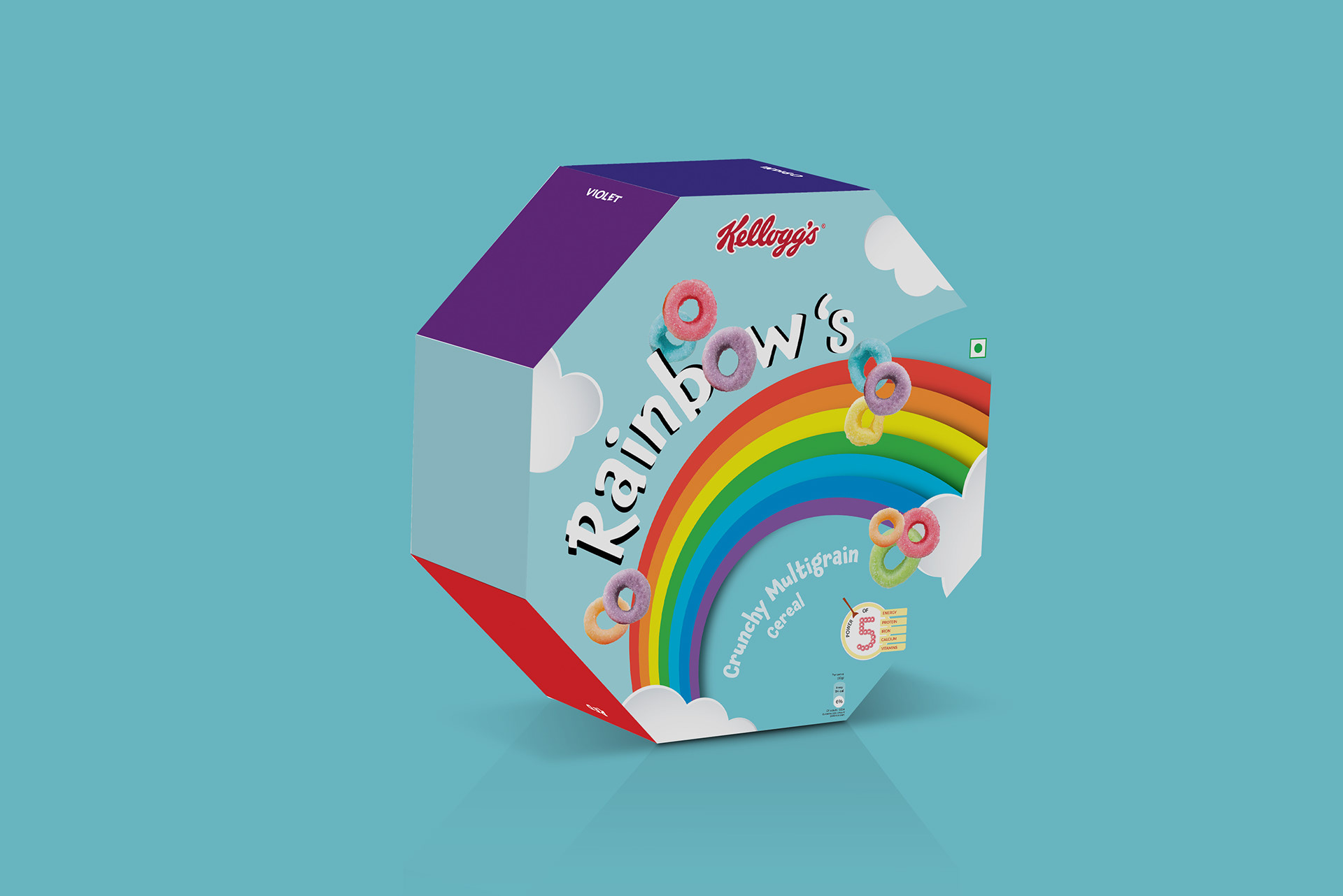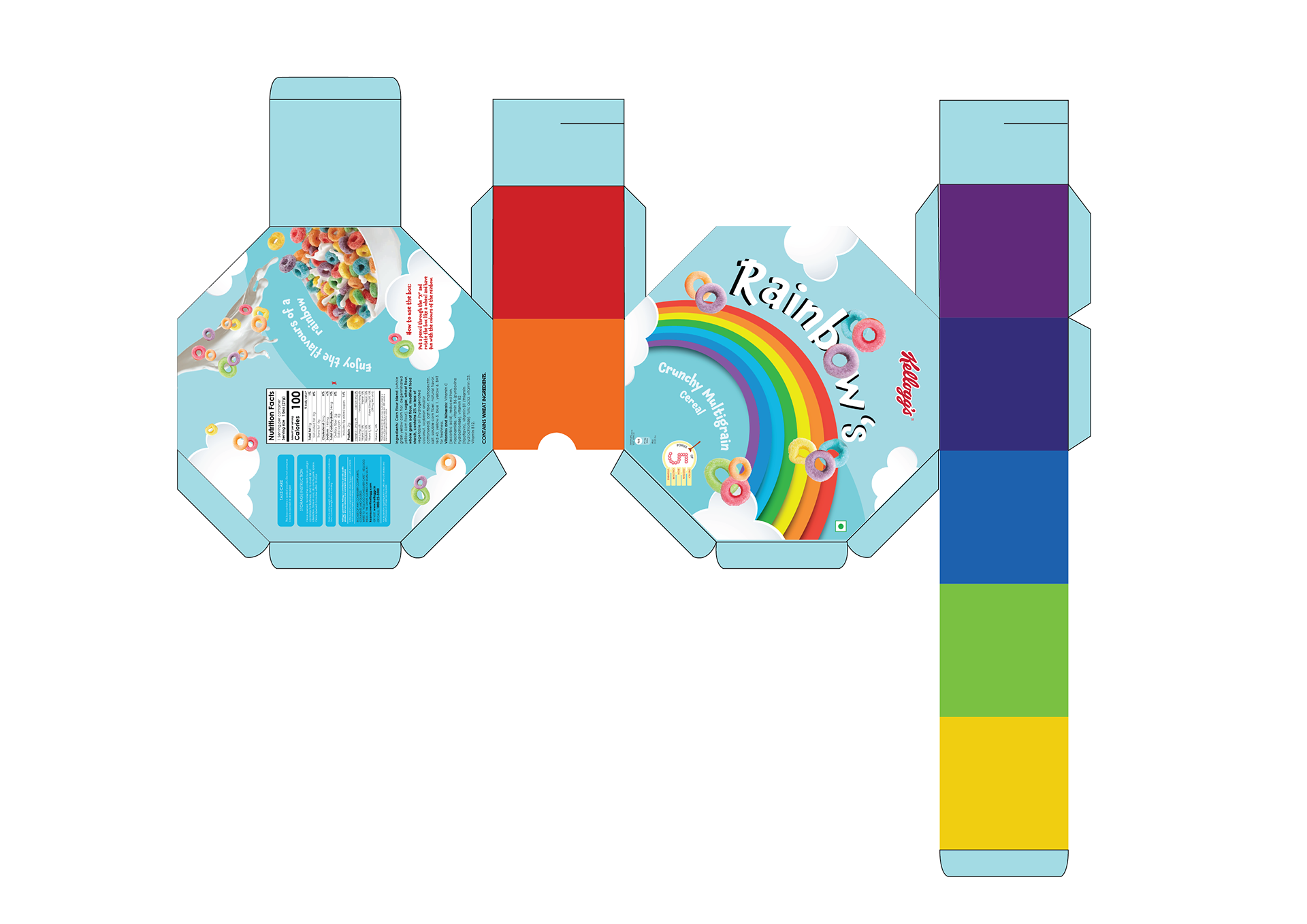 The idea for an octagonal box comes from the concept of the rainbow which has 7 colours, Violet, Indigo, Blue, Green, Yellow, Orange and Red in that order. The 8th side of the octagon is the opening flap to pour the cereal.