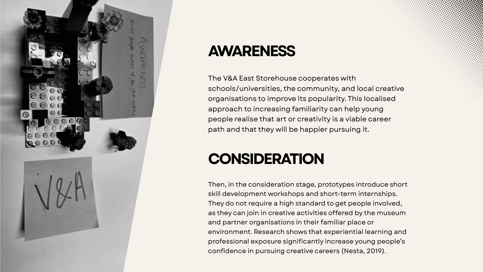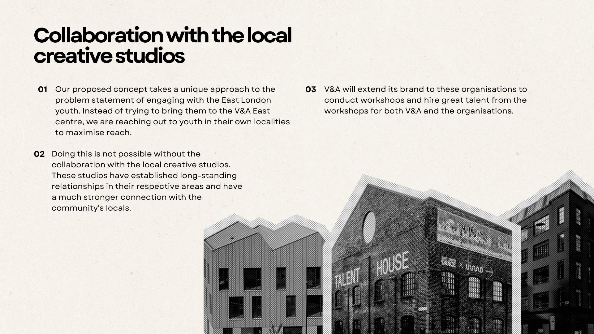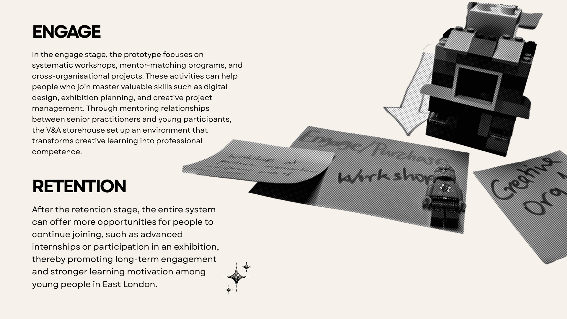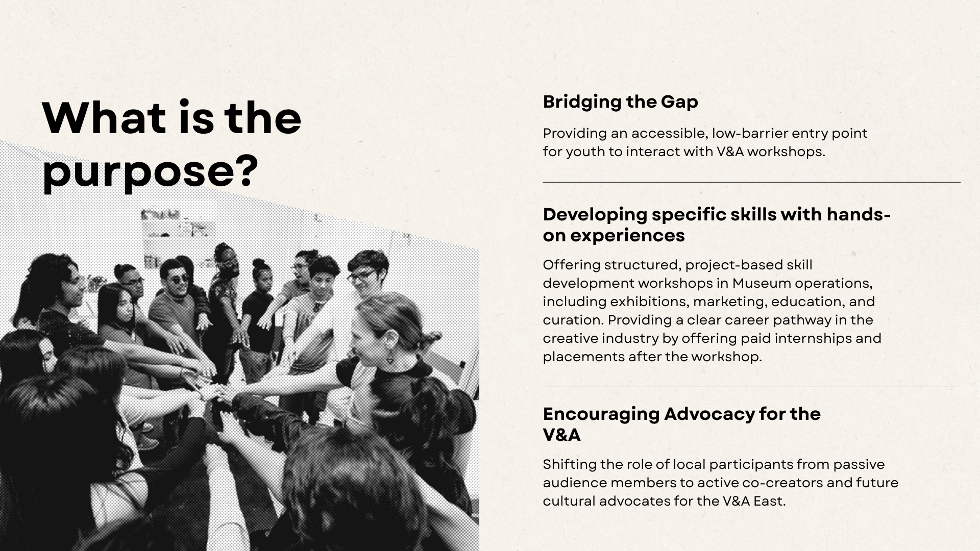 This service introduces The Youth Workshops, an interactive, co-designed workshop model specifically developed to support V&A East’s mission of making the Storehouse a meaningful and engaging space for East London youth between the ages of 16 and 25.